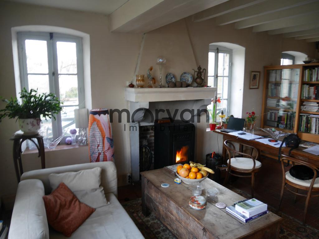 Entrée par le séjour de 32m2 avec tommettes au sol, belle cheminée avec poêle à granulé, pièce très lumineuse.