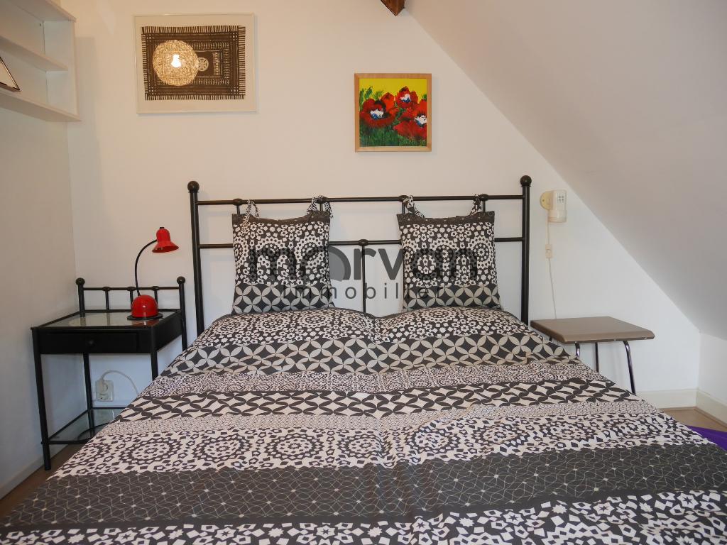 Premier étage, palier de 8m2 avec coin couchage (lit double), chambre de 11 m2 avec parquet flottant au sol et poutres appparentes.
