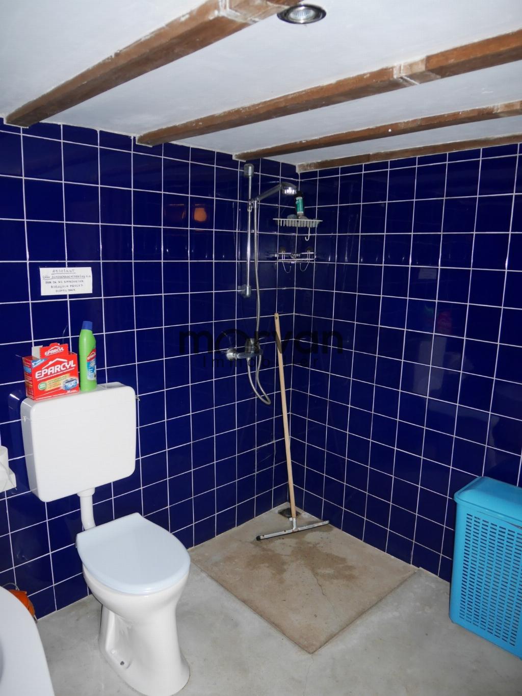 Maison principale: élevée sur 3 caves, rez de jardin: grande pièce de vie de 27m2 avec cuisine ouverte, plafond à la française, cheminée en pierre avec poêle à bois, cuisine faite sur messure en beton, avec des portes de placard en Inox.