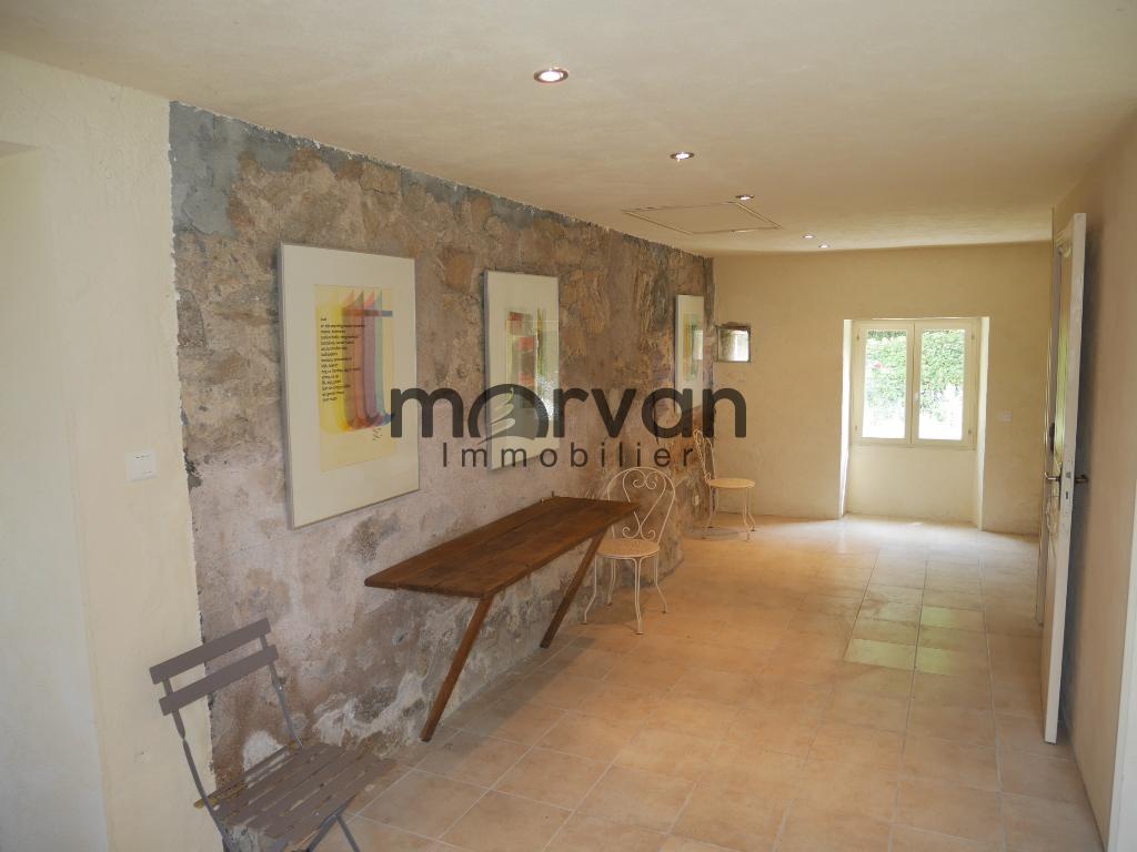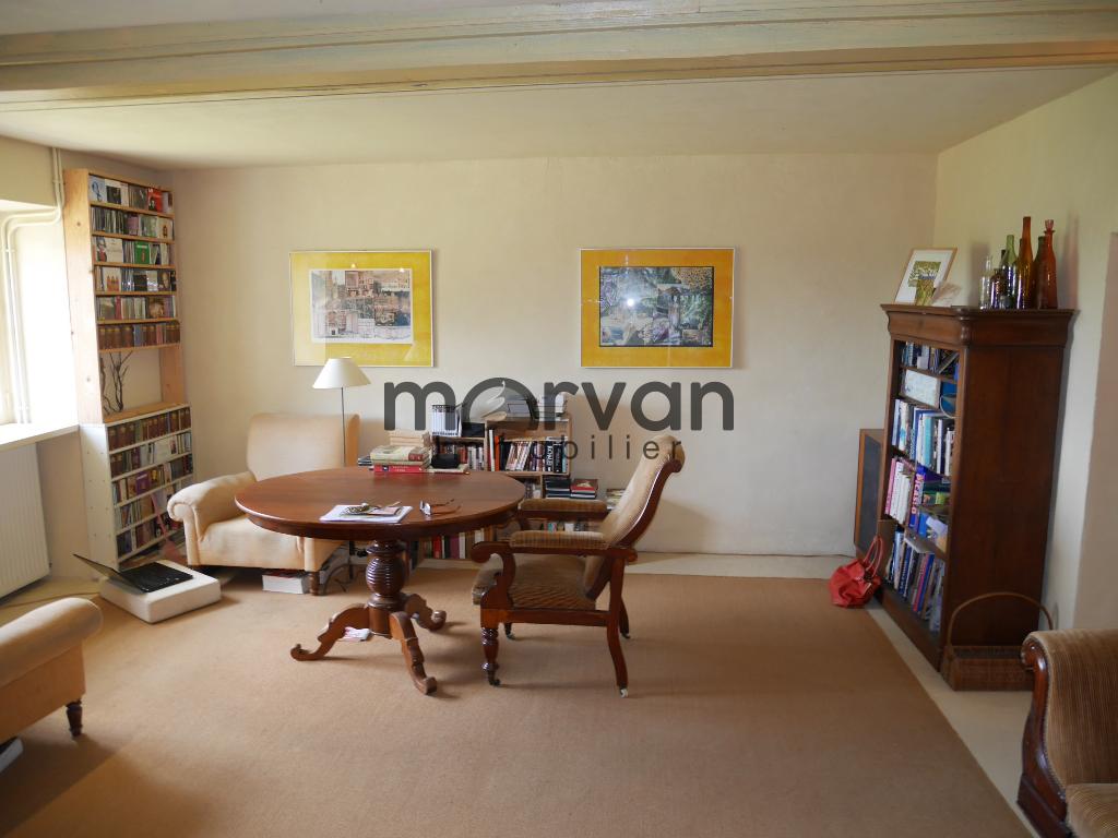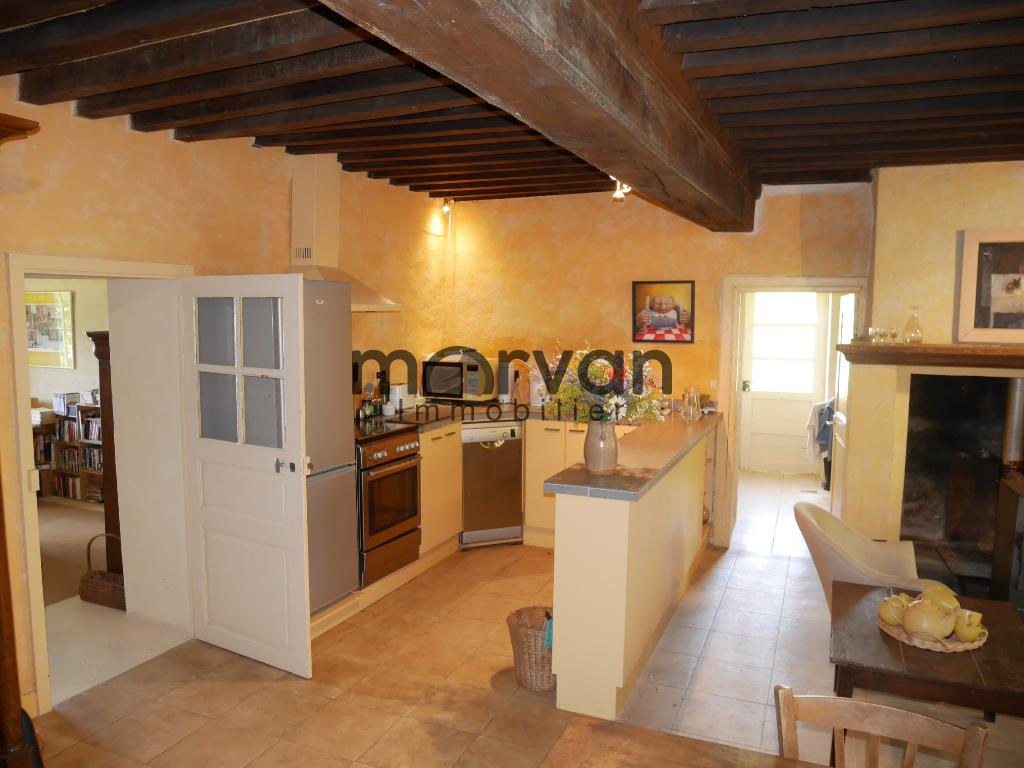 La cuisine communique avec le salon de musique qui se situe dans la première grange de 30m2 transformée en habitation avec murs en pierres apparantes, parquet chêne-massif au sol et une grande porte vitrée ouvrant vers la terrasse devant la maison exposée Sud-Est.