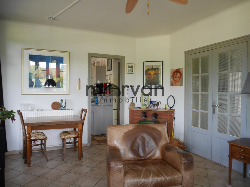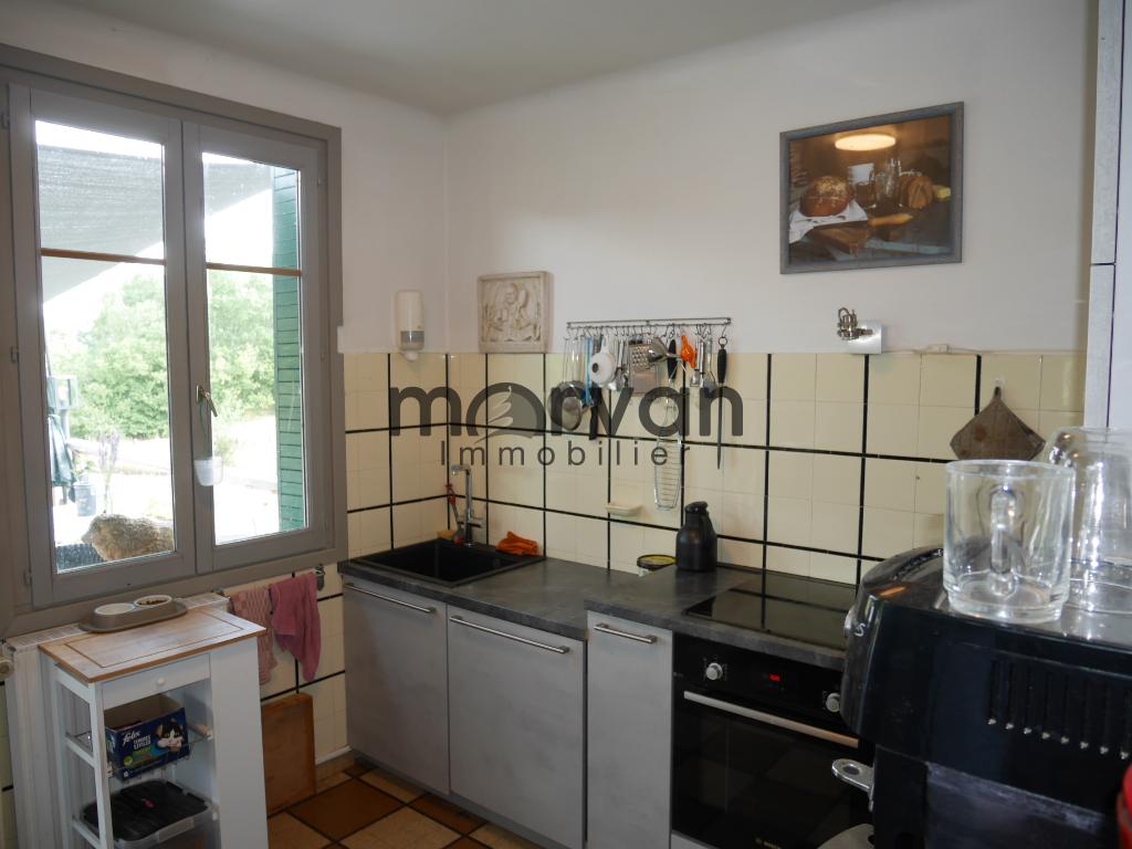 Cuisine attenante de 9m2 récente et équipée avec portes fenêtres vers la terrasse et une porte avec accès par l'escalier vers le sous-sol.