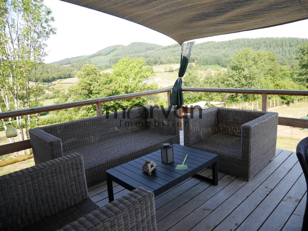 Escalier en bois à l'extérieur vers l'étage de vie, entrée par grand couloir de 11m2 desservant un salon de 20m2 avec grandes fenêtres (double vitrage) et une très belle vue sur les collines du Morvan. Double portes fenêtres ouvrant sur la grande terrasse en bois et sur pilotis.