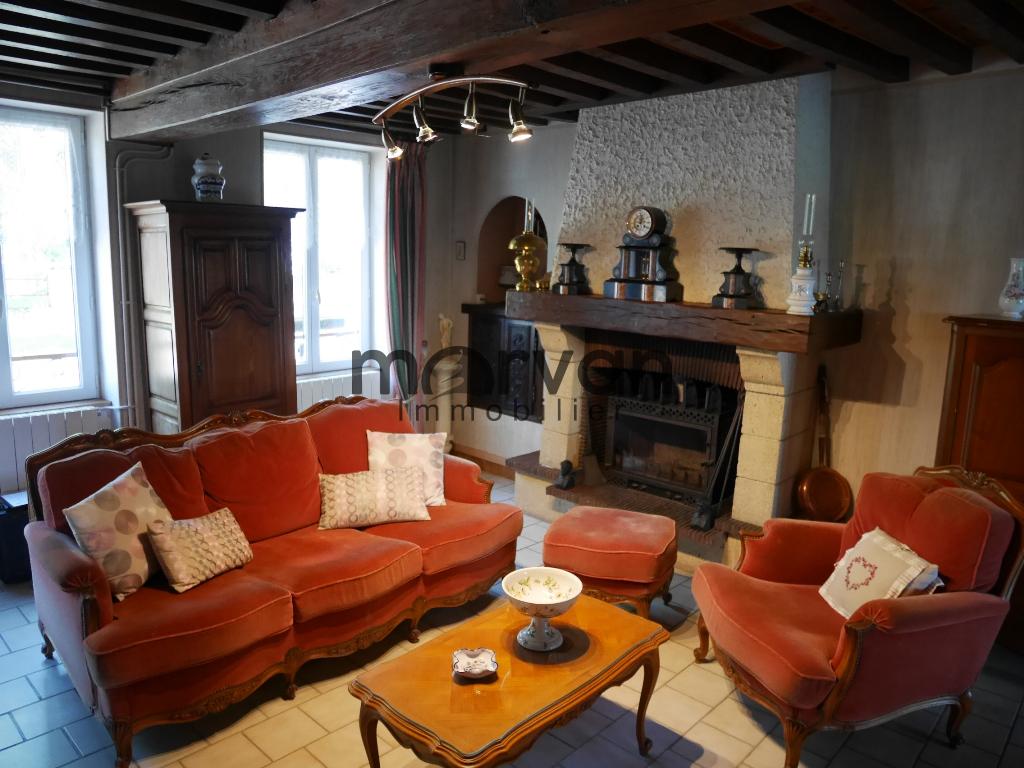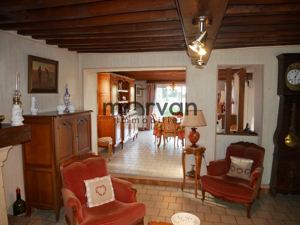 Entrée par séjour avec cheminée et insert, salle à manger très lumineuse, exposée Sud avec des baies vitrées coulissantes vers la terrasse et le jardin.