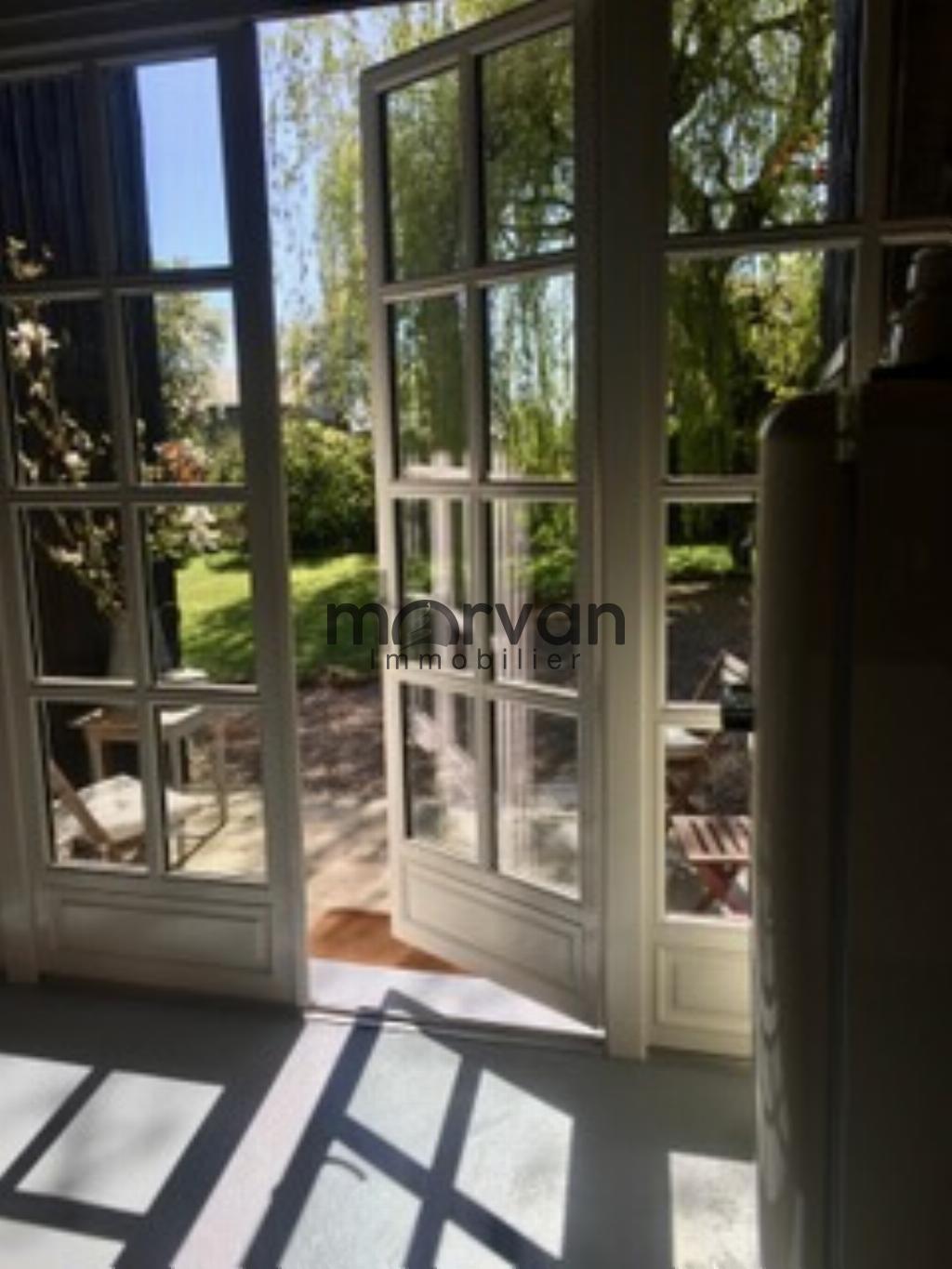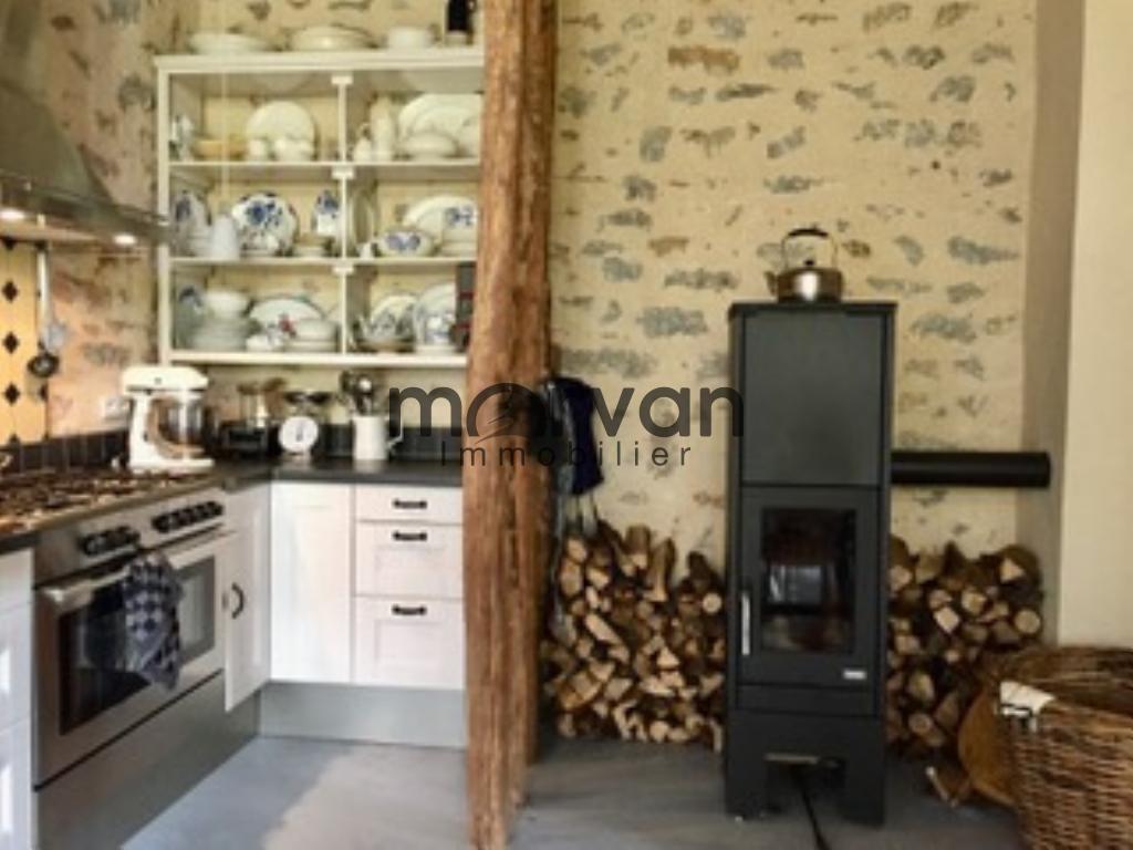 Ancienne grange transformée en cuisine et séjour de 22 m2, cuisine équipée avec chauffage au sol. Grande belle vitrée ouvrant sur auvent et le jardin.