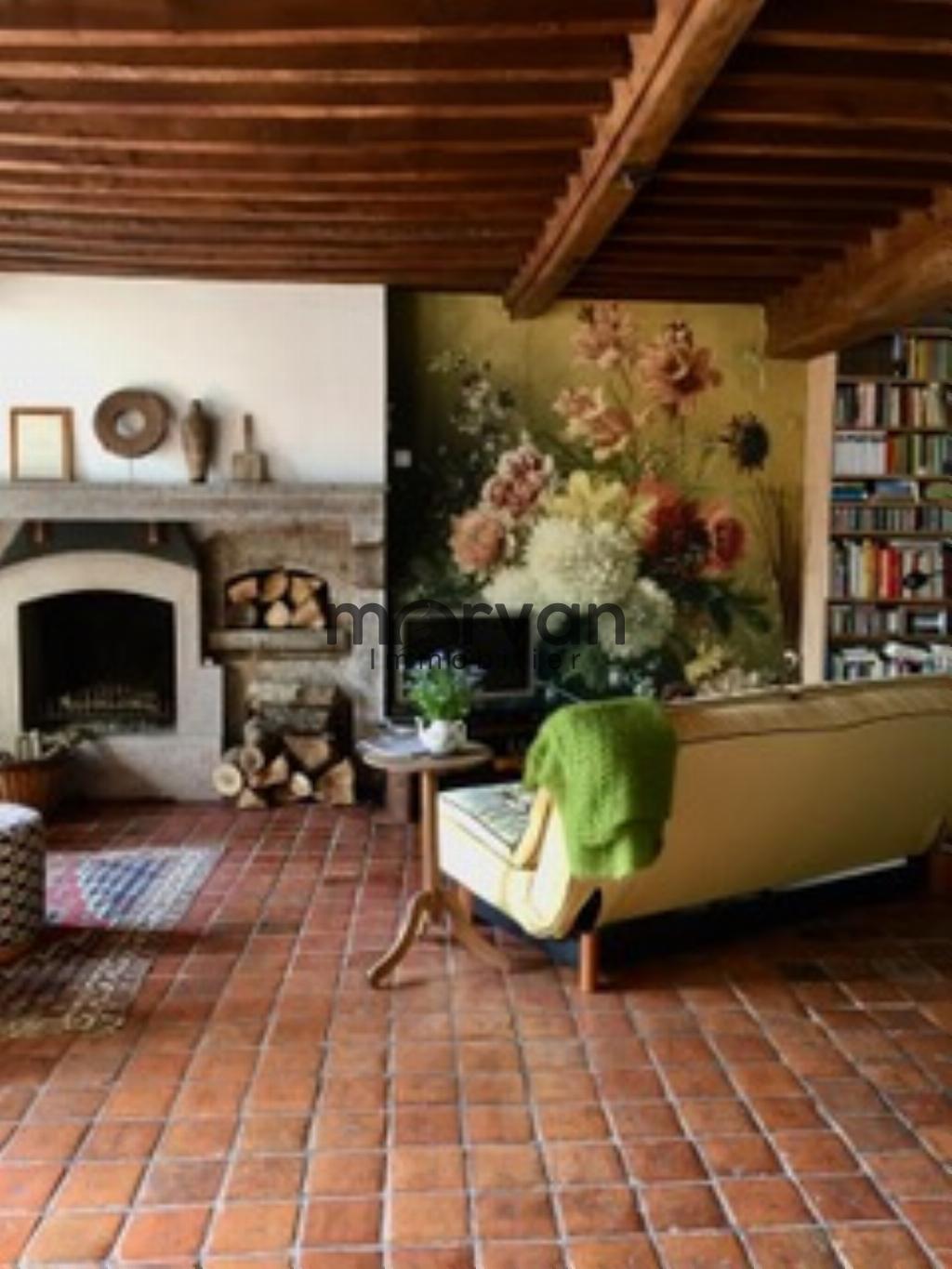 Hall d'entrée de 11m2 donnant accès à un grand salon d'environ 44m2 avec tomettes au sol, plafond à la française, une cheminée avec feu ouverte, deux fenêtres et porte exposée plein sud, avec survitrage.