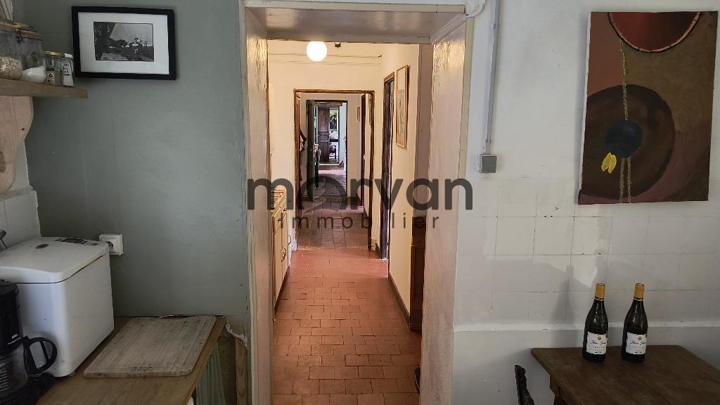 Porte depuis la cuisine qui donne sur la terrasse et le jardin. De l'autre côté de la cuisine, un couloir qui dessert deux chambres de plain-pied, une salle de bains et W.C. indépendants.