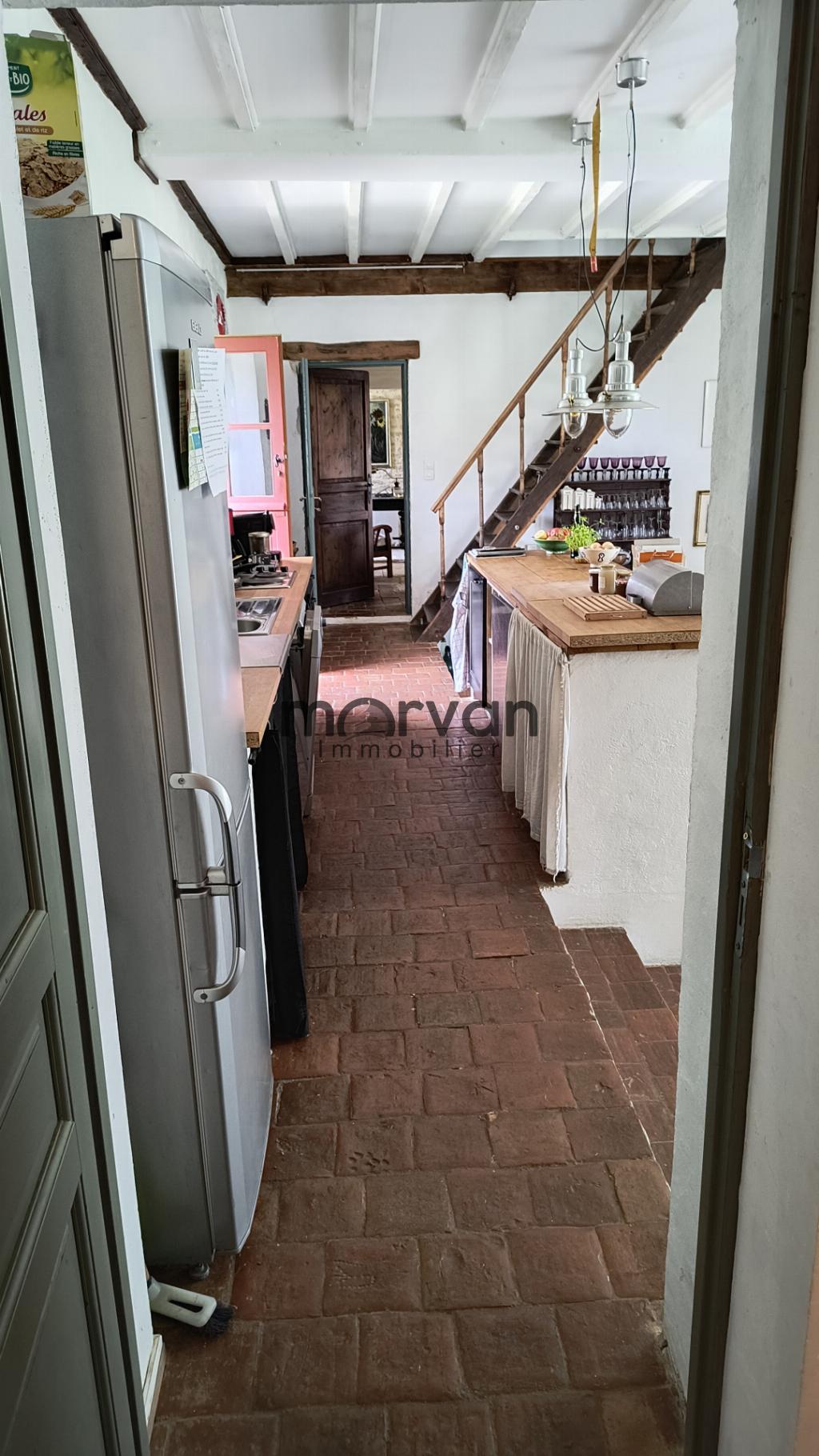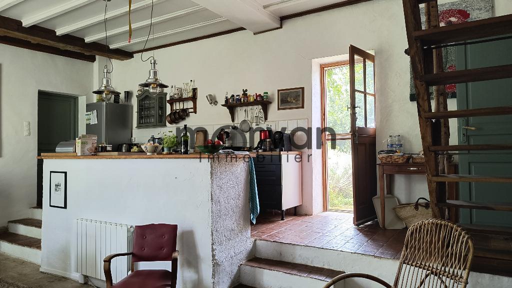 Attenant au salon une grande pièce de vie (ancienne grange) avec sa cuisine et sa salle à manger avec des tomettes au sol et son propre poêle à bois et une grande baie vitrée dans l'ancienne porte de la grange.