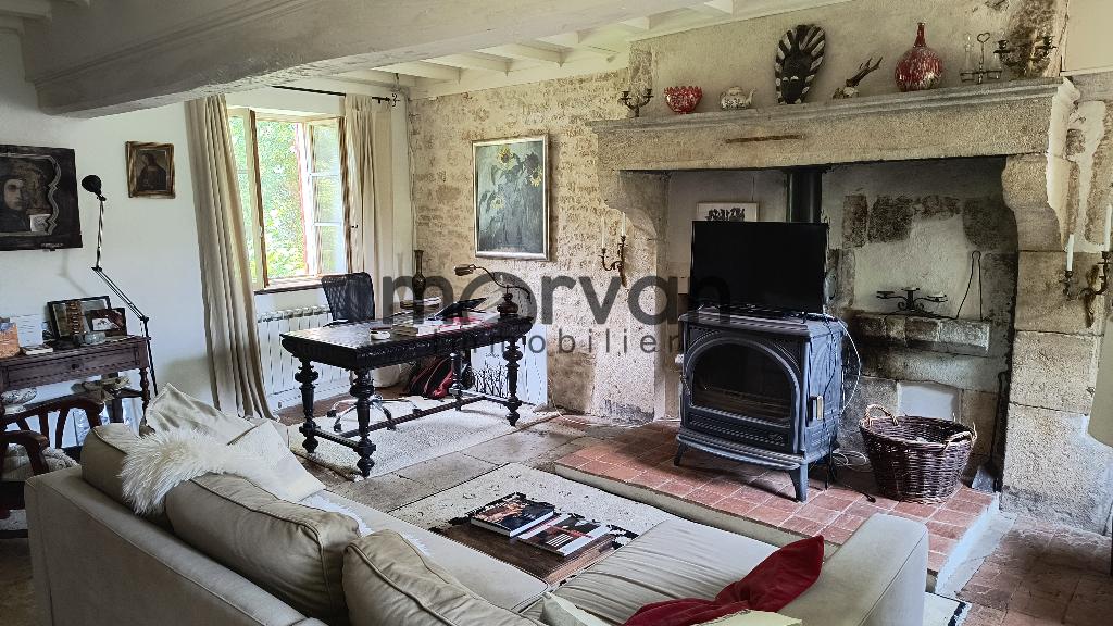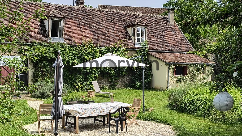 Maison de caractère avec un beau jardin privatif qui donne sur les prairies du Chateau d' Arthel. Maison en partie élevée sur deux caves voûtées, entrée par la première partie de la maison, salon avec dalles de Bourgogne, plafond à la française, belle cheminée en pierres taillées et un poêle à bois de la marque 'Godin'.