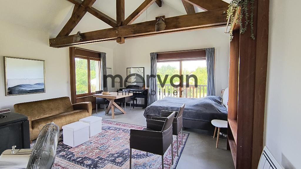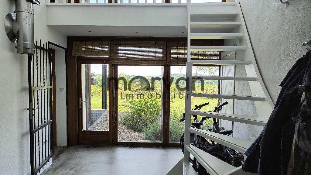 Au dessus la cuisine, mezzanine salon avec des grandes baies vitrées coulissantes, qui s'ouvrent sur un balcon (assis dans son fauteuil devant le poêle à bois cheminée ouverte, on peut profiter de la superbe vue sur le jardin et la campagne Morvandelle). Au premier étage chambre lumineuse avec porte fenêtre ouvrant sur balcon, salle de bains attenante, et pièce de rangement.