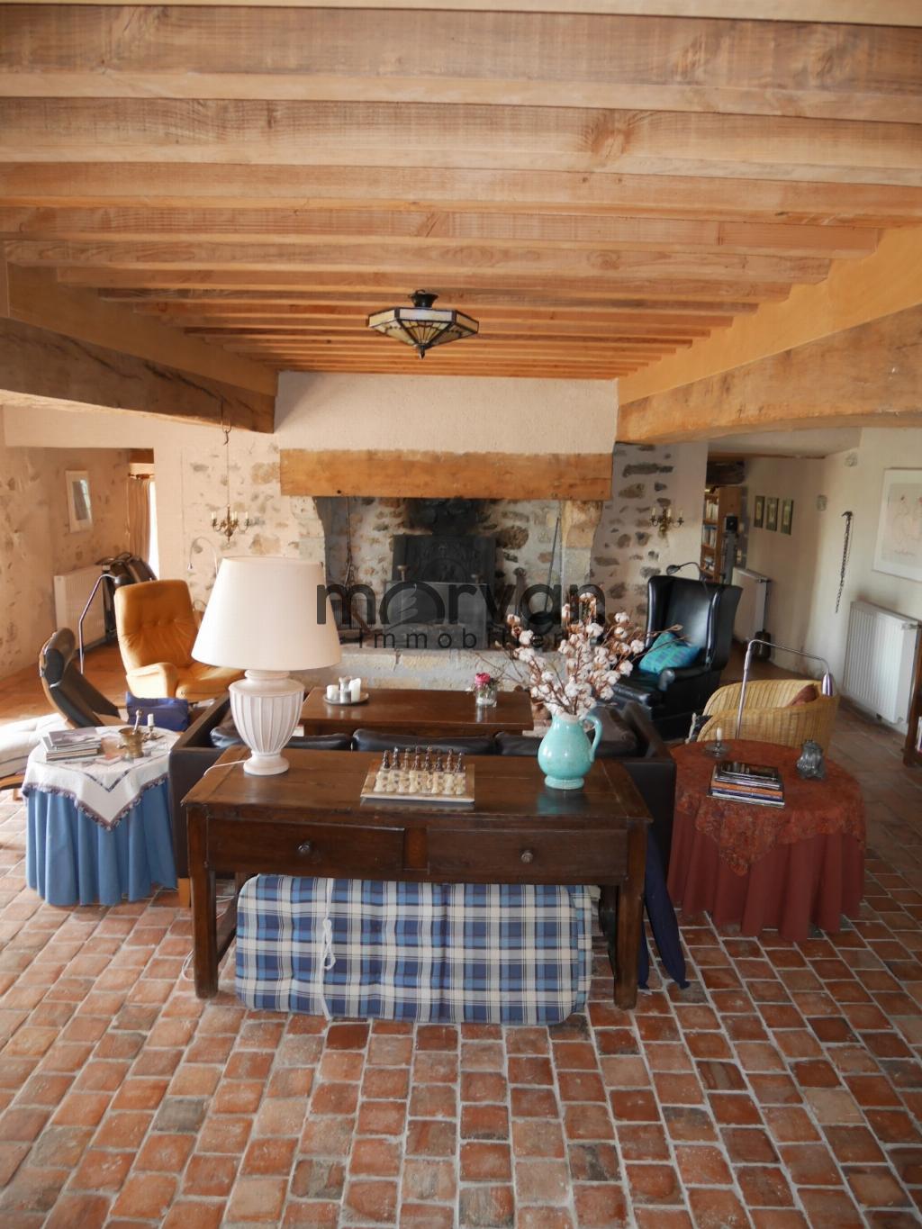 Le séjour communique avec le salon de 52m2 (une grande cheminée, plafond avec poutres et tomettes au sol). quelques marches vers un dégagement desservant deux chambres de plain-pied: