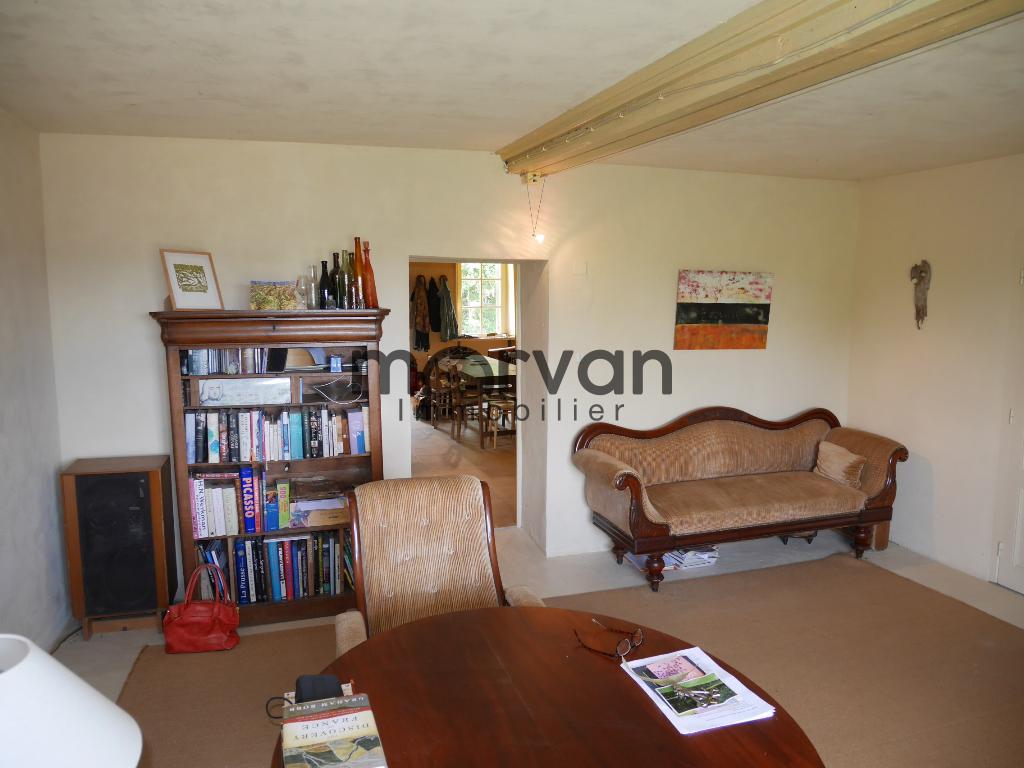 La cuisine communique avec le salon de musique qui se situe dans la première grange de 30m2 transformée en habitation avec murs en pierres apparantes, parquet chêne-massif au sol et une grande porte vitrée ouvrant vers la terrasse devant la maison exposée Sud-Est.