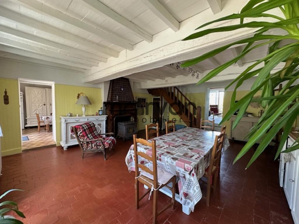 " Une maison d'habitation mitoyenne élevée partie sur cave comprenant au rez-de-chaussée: un grand séjour avec cheminée, une cuisine, un salon ouvrant sur terrasse et très jolie vue, une salle d'eau et WC (toilettes sèches). Au premier étage: quatre chambres, une salle de bains, WC séparés et petit grenier en sous pente pour rangement. Un garage en face. Dépendance: grenier, chaufferie, un petit local et cave.