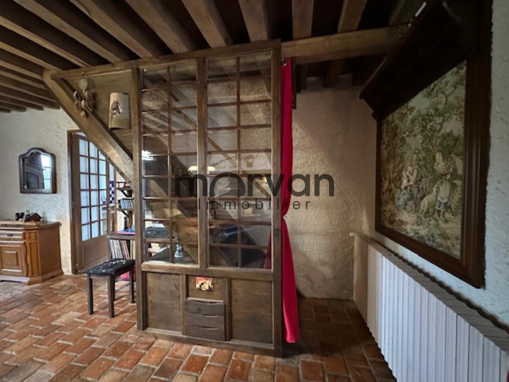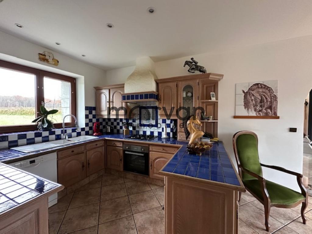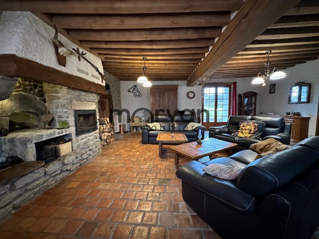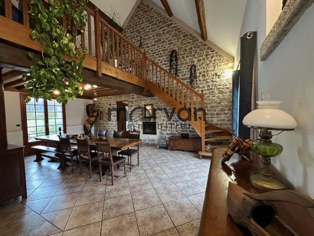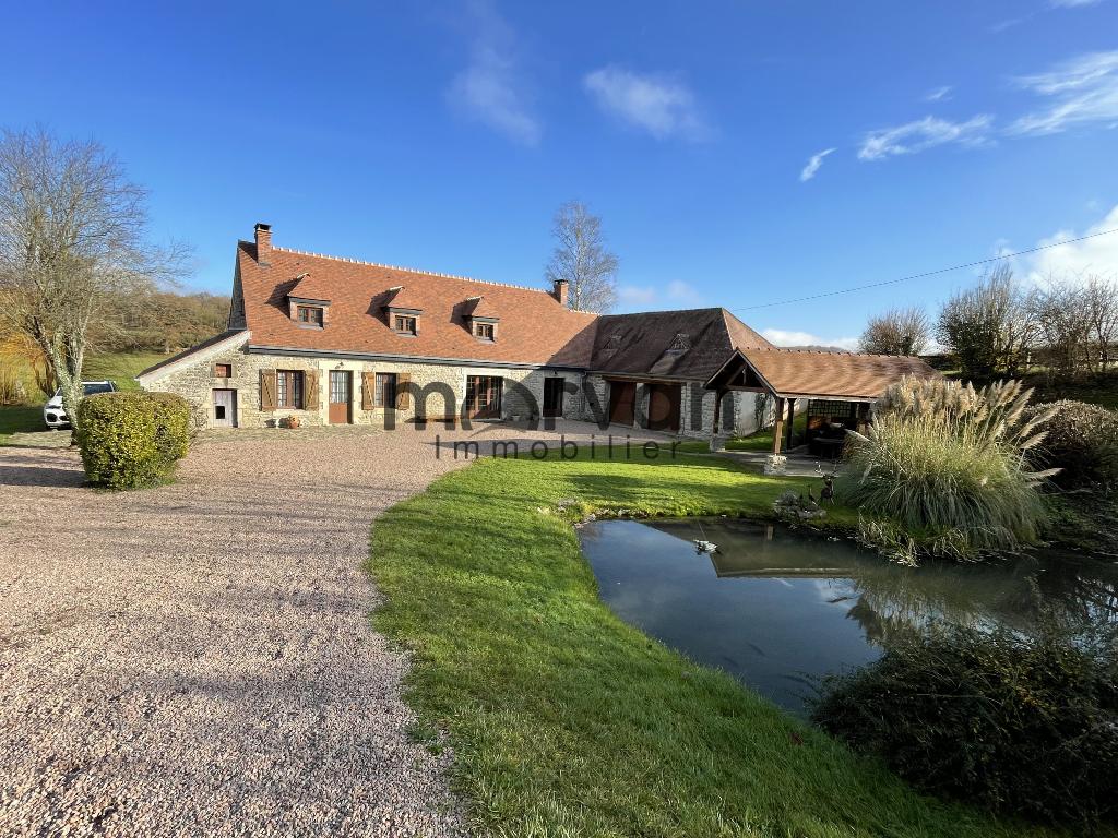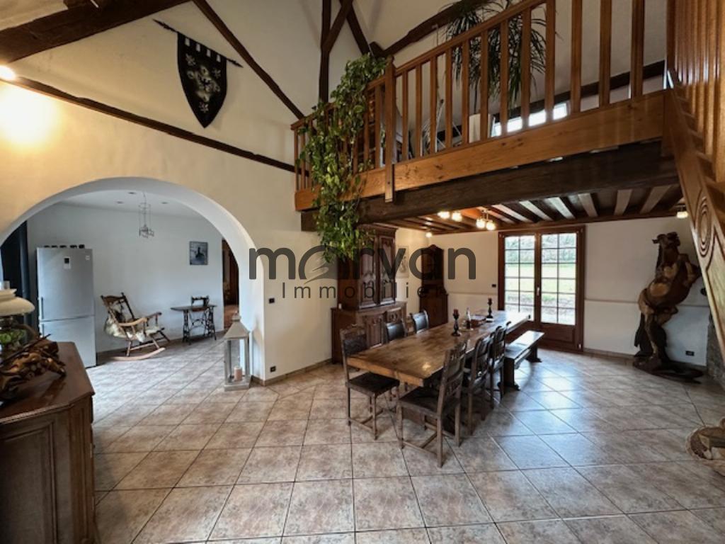 " Magnifique propriété en bord de ruisseau avec terrain de 28700 m2 environ comprenant une maison d'habitation couverte en petites tuiles plates (toiture neuve et isolée) élevée sur terre plein d'un rez de chaussée composé : salon avec cheminée et porte fenêtre ouvrant sur terrasse (vue sur les prés de la propriété), cuisine aménagée suivie d'une grande salle à manger (plafond cathédrale) avec mezzanine (à usage de bureau ou coin detente), chaufferie (avec evier, accès à l'arrière de la maison et aux garages), salle d'eau avec WC (buanderie). Deux grands garages à la suite (dalle béton grande hauteur sous charpente).